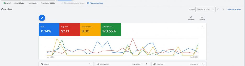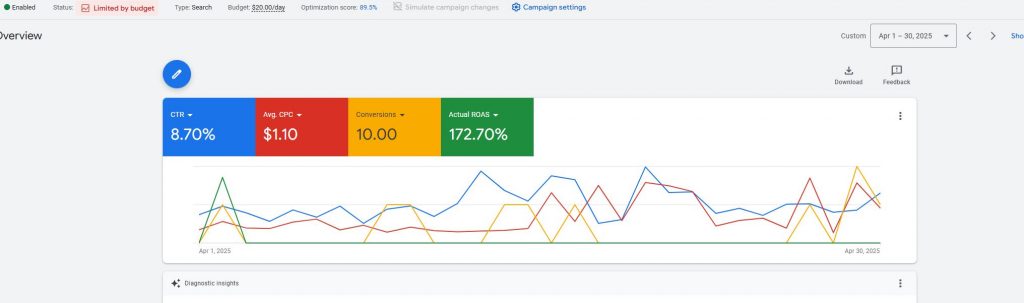 We assess your business goals and competition to determine if Google Ads is a good fit. Generally, if your customers are searching for your products or services online, Google Ads can drive high-quality traffic and conversions. We’ll also analyze factors like budget, profit margins, and audience demand to make sure that you can benefit from running Google ads.